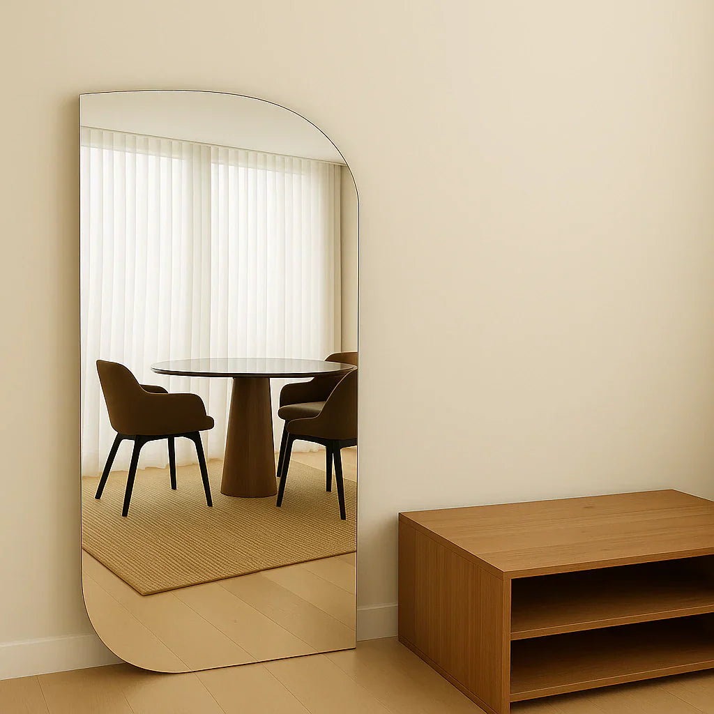Los bordes del espejo están biselados y pulidos con precisión, lo que proporciona un acabado suave y sofisticado que realza aún más el diseño de la pieza.