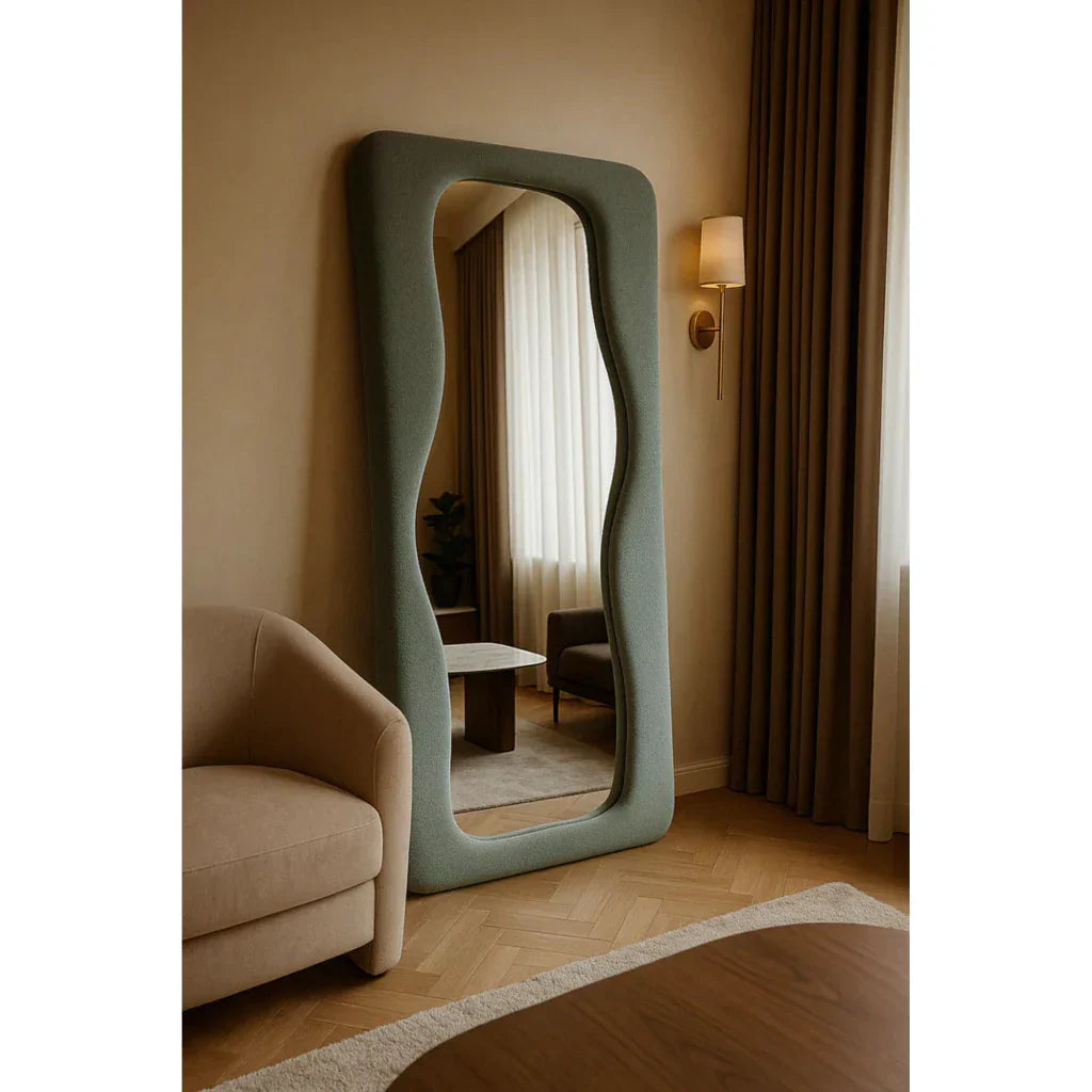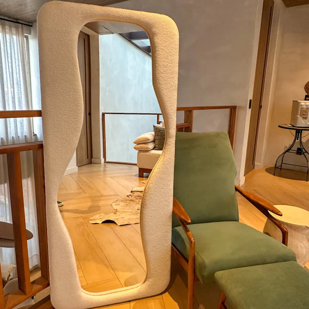 Su marco con acabado tejido transforma el espejo en un impactante elemento decorativo, creando un énfasis visual y enriqueciendo la composición de la habitación.